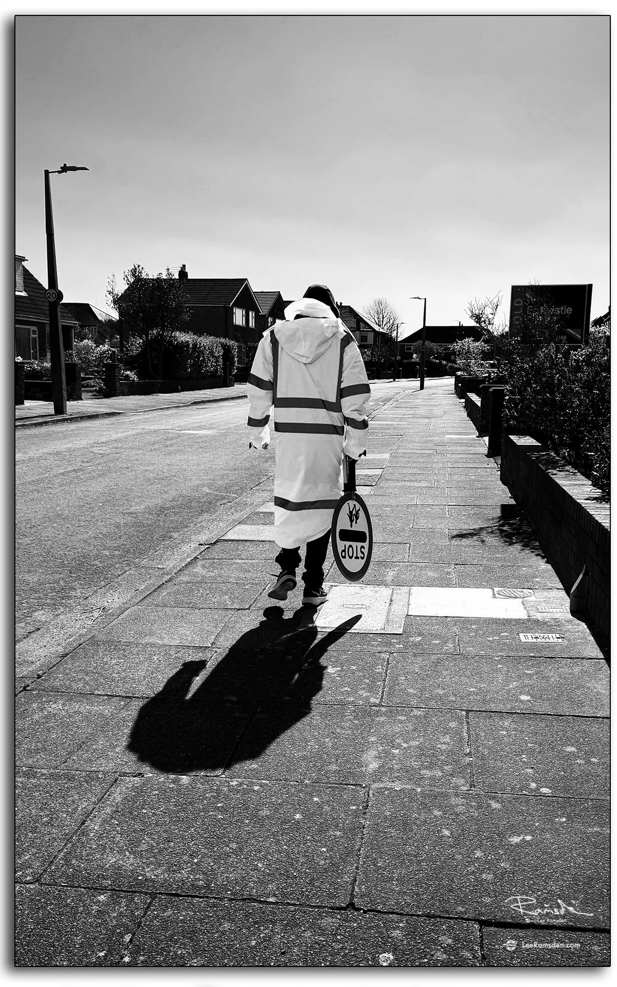 These photographs focus on ordinary subjects seen in a different light. The first isolates a pigeon against a clear sky, with architectural detail in the background adding context and balance. The second captures a lollipop man walking away, his shadow stretching across the pavement.