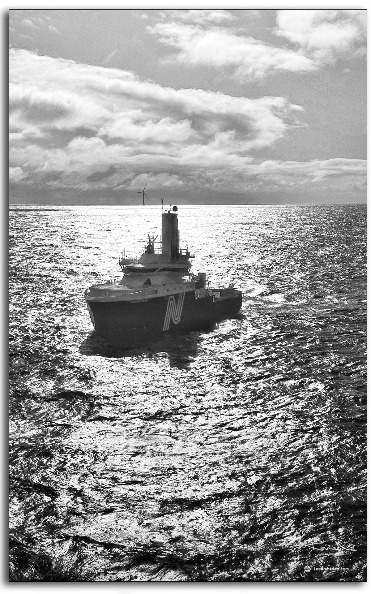 Out in the North Sea, the Norwind Storm support vessel takes position beneath the setting sun, a steady presence against the rolling water. These iPhone images capture both the vessel itself and its role within the offshore wind environment — working alongside turbine structures and platforms.